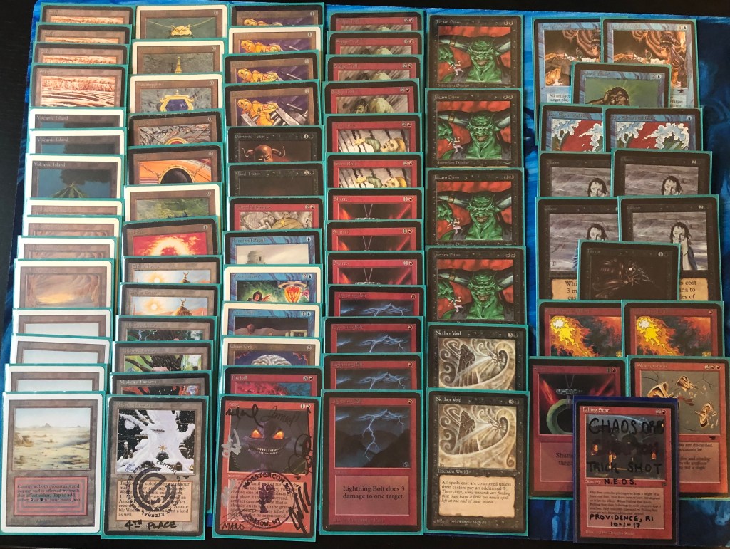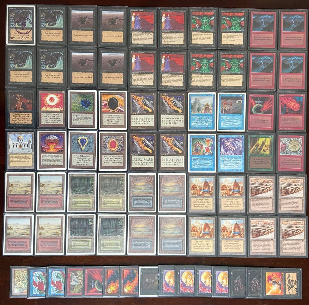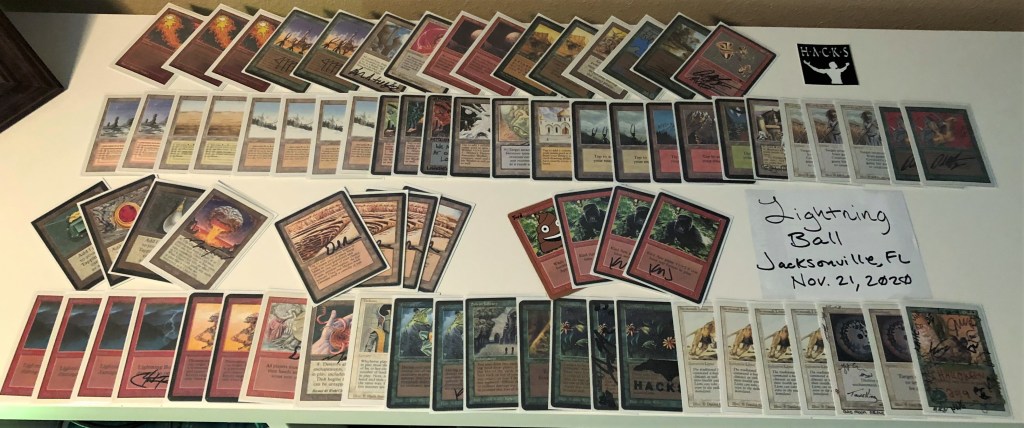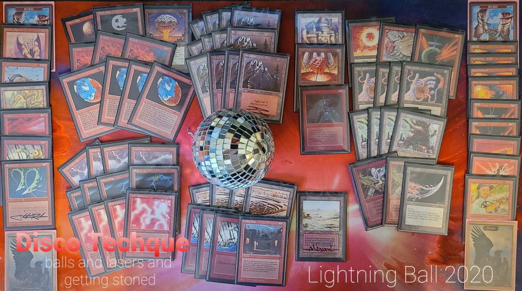 The LIGHTNING BALL, a one-day webcam Old School Magic tournament, was held on Saturday, November 21st, 2020. A total of 86 players representing eight different time zones and at least two dozen regional Old School clubs participated. Deck construction rules for the event used the Eternal Central B&R list. The structure of the event was straight Swiss pairings, 50-minute rounds, just as one might expect at a “real-life” paper tournament. All of the matches for the event were played using Whereby, one of the video chat platforms of choice for the 93/94 webcam scene.