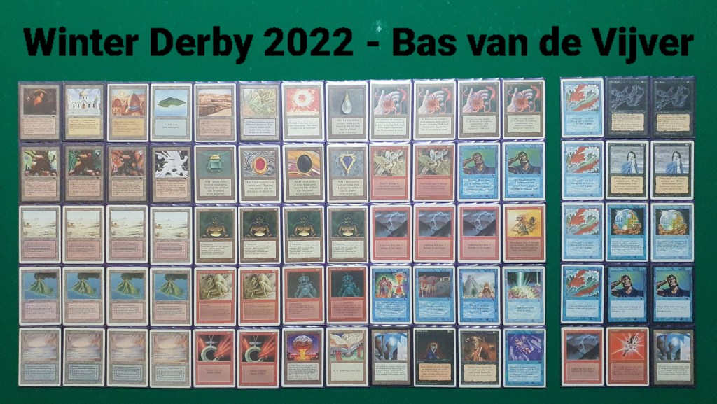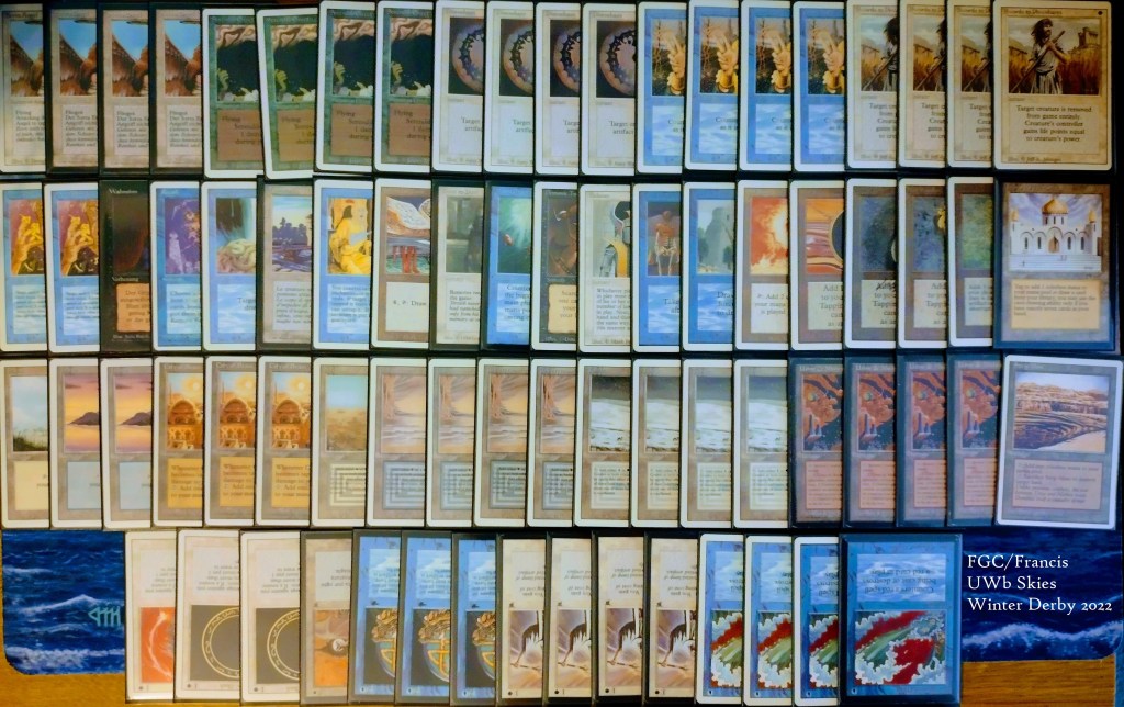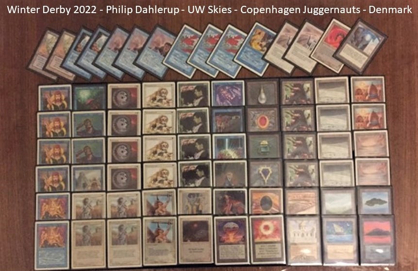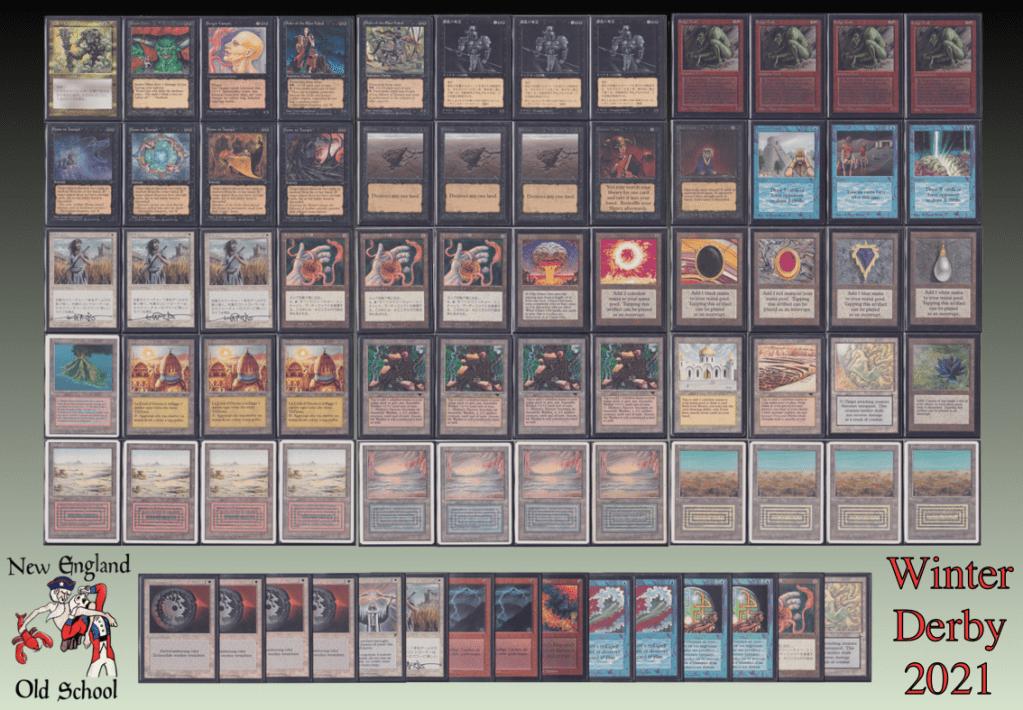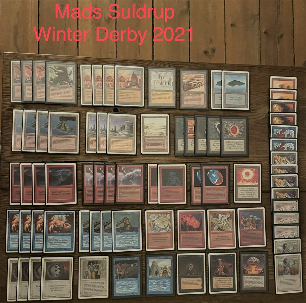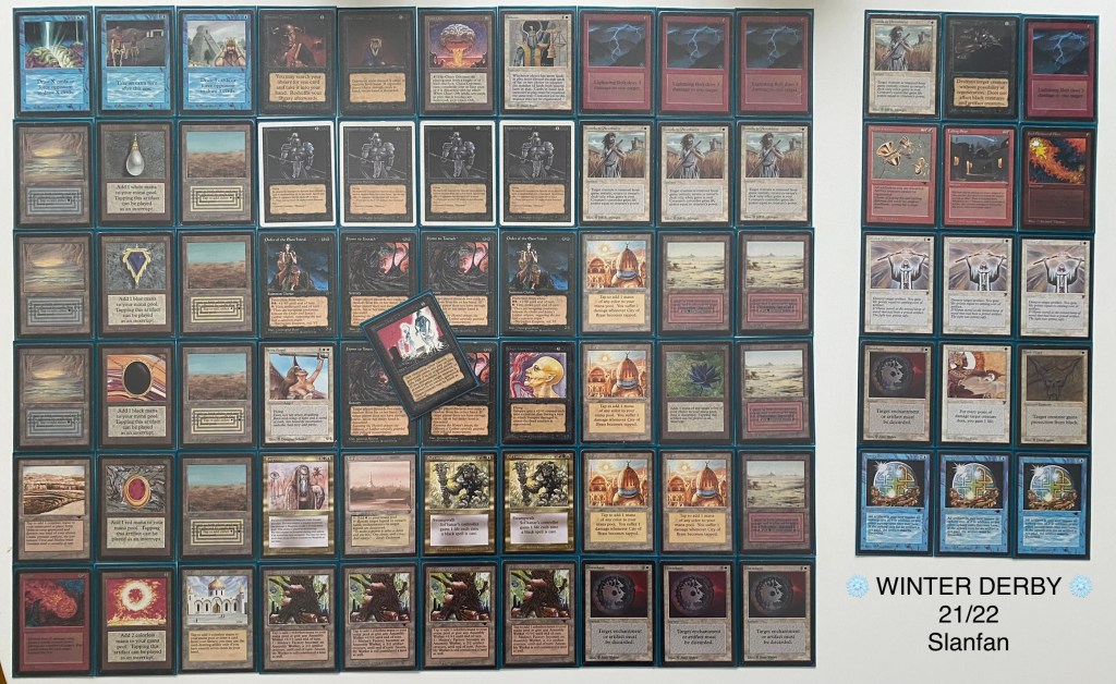 The Derby series rotates between different 93/94 format variants every six months. Past Derby events have used the Swedish, Atlantic, and 4-Strip B&R lists (including Eternal Central, Pacific, and Boreal). This instance of the Winter Derby was played using the Atlantic 93/94 B&R list, allowing the full range of original art/old card frame re-prints (Revised, 4th/Chronicles, CE/IE, FBB/FWB, etc.).