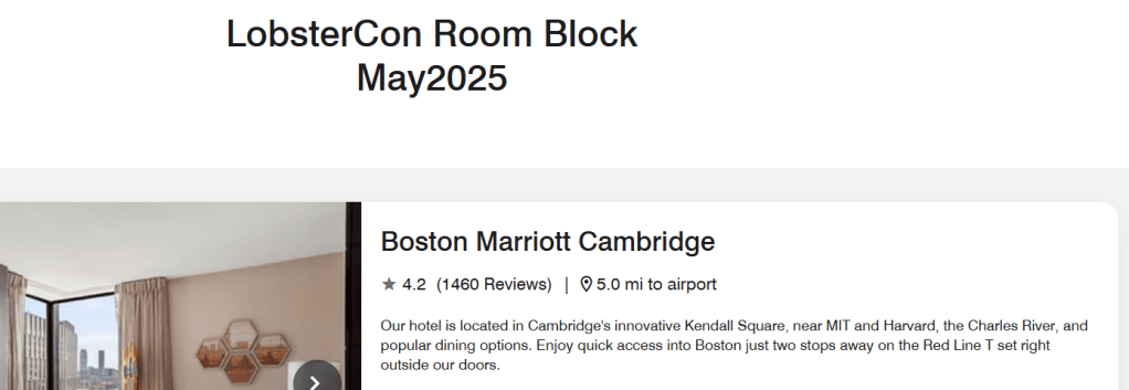 Lobster rolls from Kelly’s Roast Beef will be available during the main event on Saturday, with pre-orders opening about 10 days before the event. On Friday evening, there will be a complimentary pizza order for all paid registrants. All other meals will be “bring your own food,” with a list of nearby take-out recommendations provided. A full-service bar will be available throughout the weekend.
