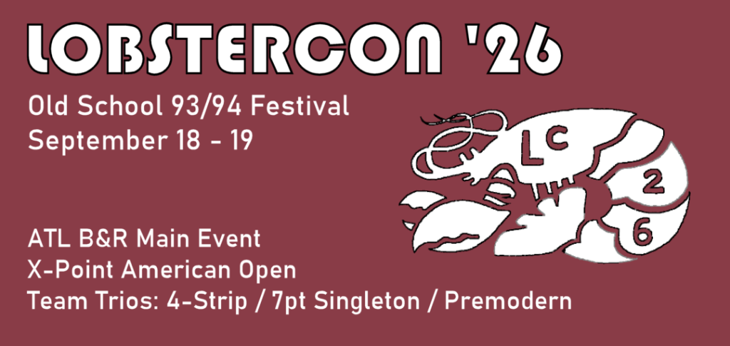 Saturday, September 19, 10:30am – 8pm. The annual LOBSTERCON tradition continues with another big opportunity to jam this popular and accessible 93/94 variant. Deck construction rules at the X-Point Old School website. Tournament structure will be straight Swiss (7 or 8 rounds).
